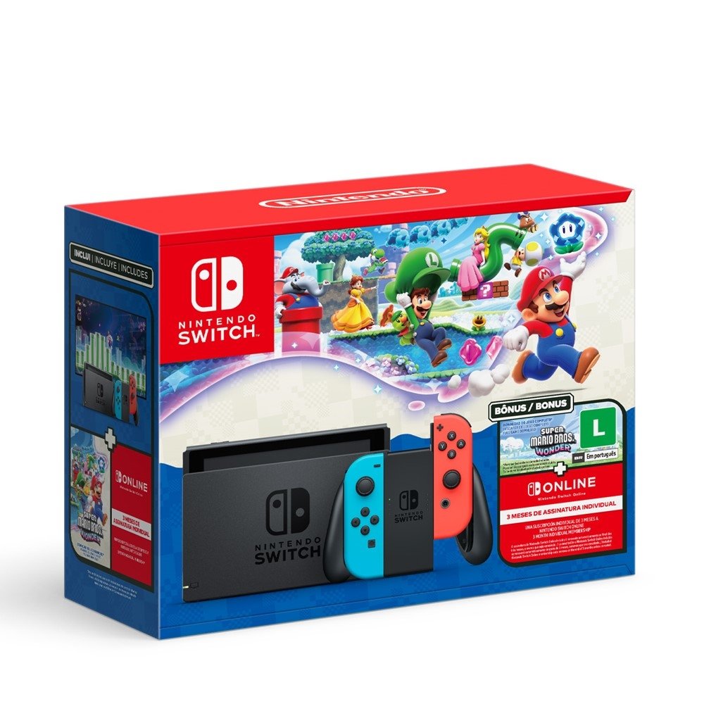 | Conteúdo da Embalagem | - Console Nintendo Switch - Base do Nintendo Switch - Joy-Con (L) azul neon - Joy-Con (R) vermelho neon - Alças do Joy-Con - Suporte para Joy-Con - Cabo HDMI de alta velocidade - Adaptador AC do Nintendo Switch - Download do jogo Super Mario Bros. Wonder completo - Código de resgate para uma assinatura individual do Nintendo Switch Online de 3 meses |