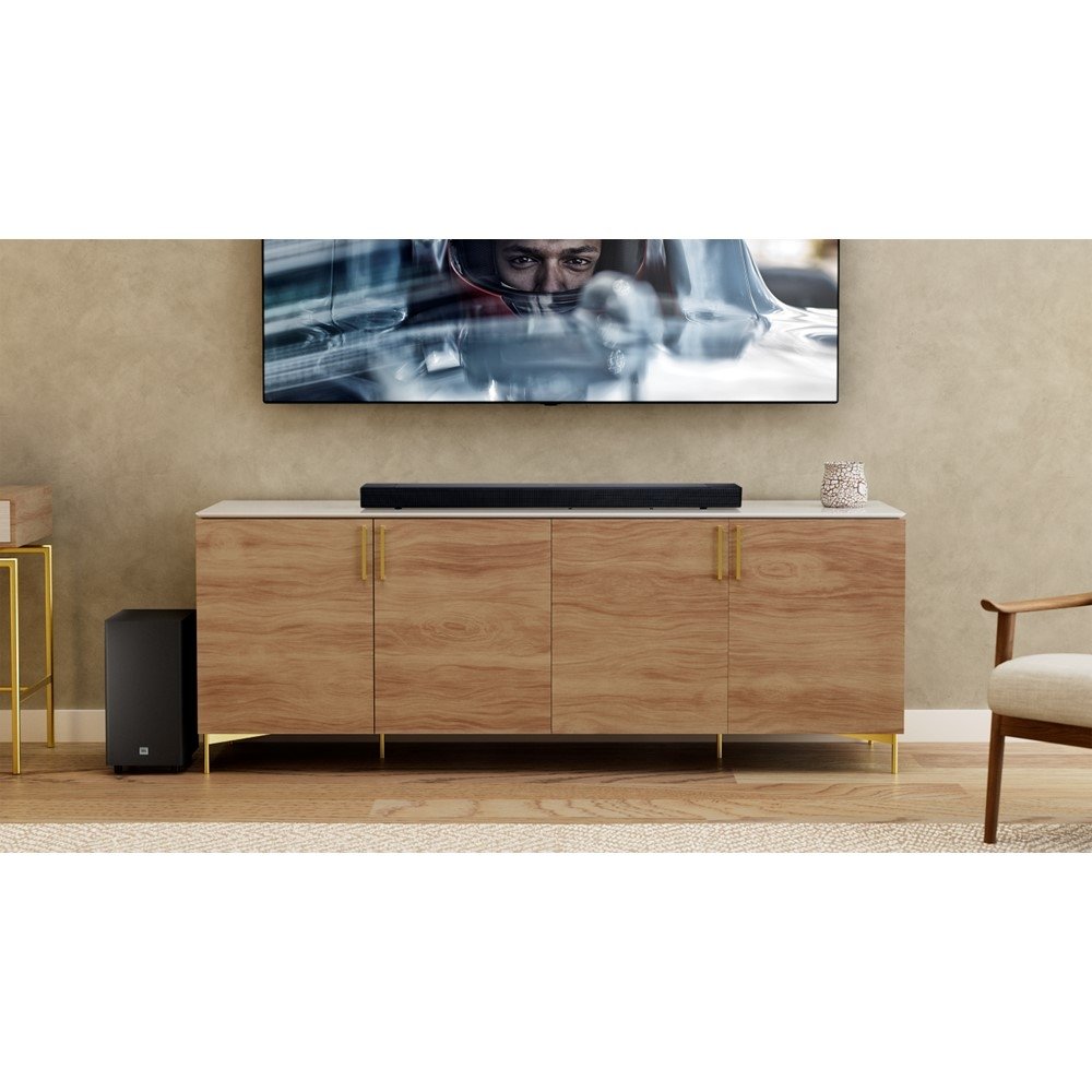 Pensada para uso prático, a JBL SB595 oferece controle simples e intuitivo, permitindo ajustar o áudio conforme o conteúdo assistido, trazendo mais conforto e personalização para sua experiência de entretenimento em casa.