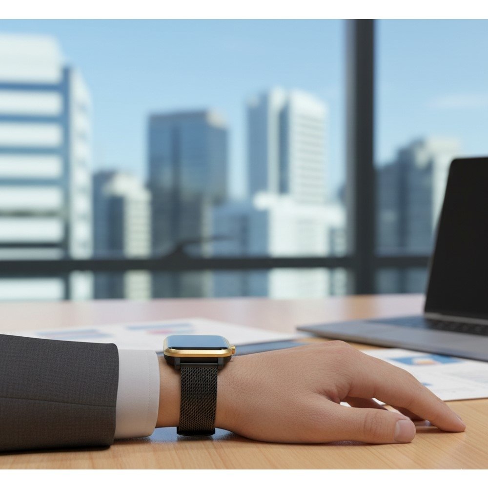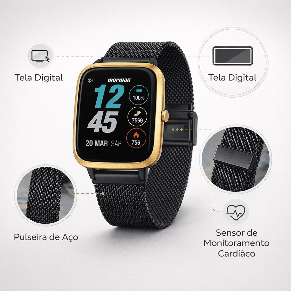O Smartwatch Mormaii Life une visual sofisticado com a praticidade que você quer no dia a dia. Com pulseira de aço e acabamento preto com dourado, ele entrega presença no look - do trabalho ao lazer - sem abrir mão da funcionalidade.