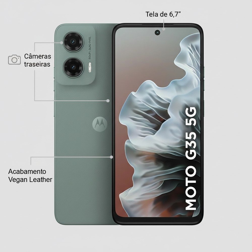 O Motorola Moto G35 5G foi pensado para quem quer um smartphone rápido e pronto para o dia a dia, com conexão 5G, muito espaço interno (256GB) e uma tela grande de 6,7" que valoriza tudo o que você faz - de vídeos e redes sociais a tarefas de trabalho e estudo.